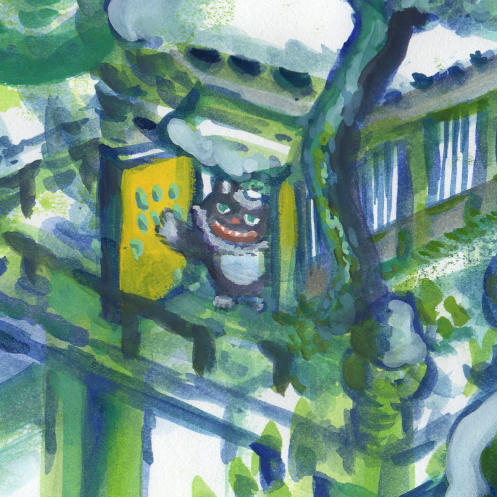謎の生き物「ぐうぐう」の旅を描いた水彩画作品を展示します。